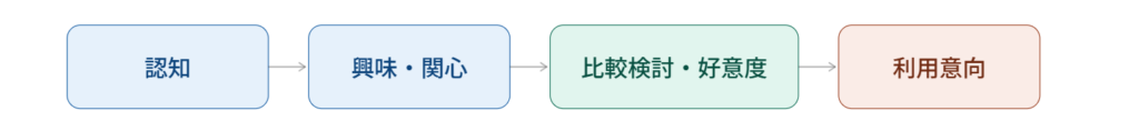 認知広告の目的は、まだ自社の商品やサービスを知らない、あるいは興味が薄い層に対して、認知・理解・好意度・利用意向といった心理変容を起こすことです。直接的な売上ではなく、「将来買ってくれる人の母数を増やす」ための投資と捉えるのが正確です。