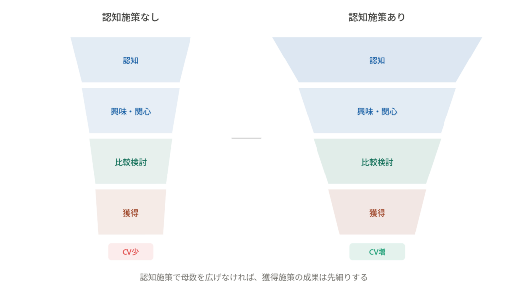 この構造的な問題を解決するには、ファネル上部の認知、興味・関心、比較検討といった各フェーズの母数を認知広告で広げるしかありません。獲得施策の成果を維持・拡大するためにも、認知施策への投資は不可欠です。