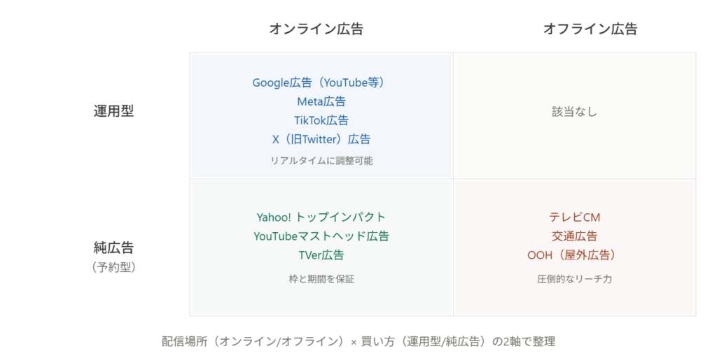 認知広告は「配信される場所」と「買い方・運用方法」の2つの軸で分類できます。この構造を理解しておくと、媒体選定や予算配分の判断がしやすくなります。